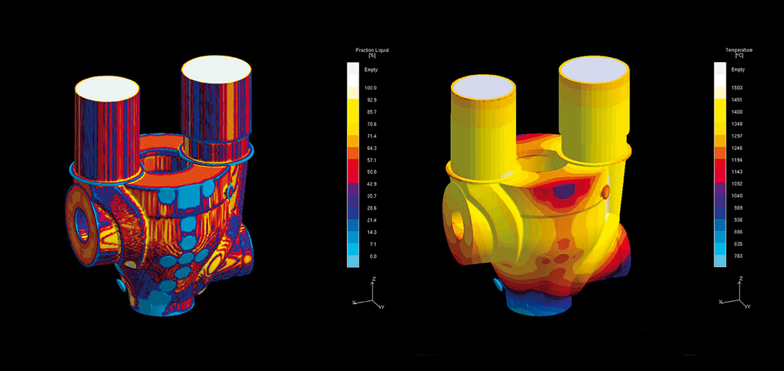 Formfüllung, Erstarrung und Spannung des Gussteils werden per Computerprogramm simuliert. Ein weiteres Modul kalkuliert das Prozessfenster - Giesstemperatur und Giesszeit- in dem die oben genannten Ergebnisse realisiert werden können. Die Rechenzeiten für eine komplette Simulation können durchaus im Bereich von mehreren Tagen liegen.